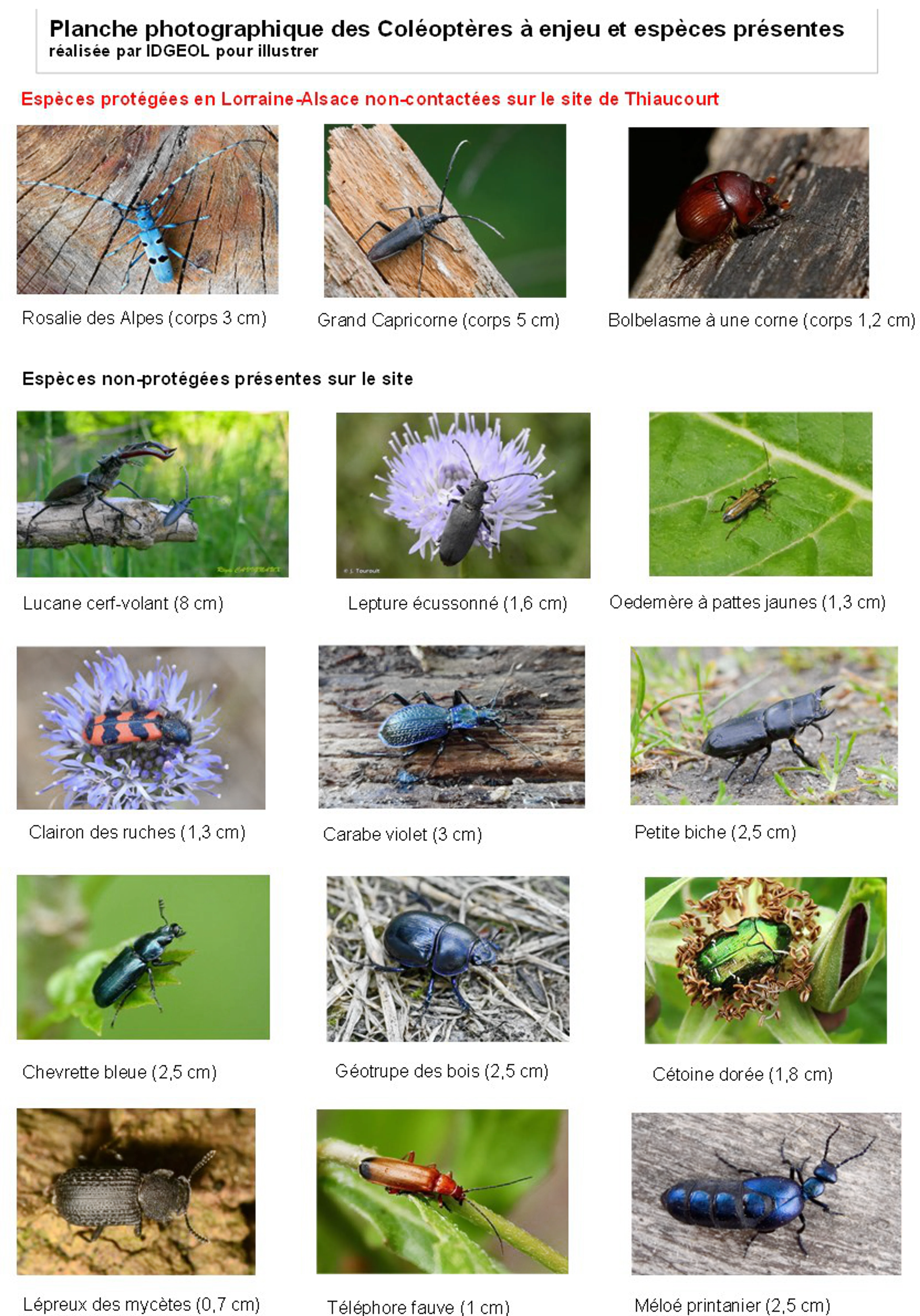 Pour autant, le même bureau d’étude recommande la mise en place de zones d’îlots de sénescence au sein du massif forestier (où on laisse les arbres morts se décomposer naturellement sur place). Ces îlots sont recommandés pour favoriser le maintien de peuplements diversifié de coléoptères même s’ils ne figurent pas dans la liste des espèces protégées. Ainsi, 5 îlots de sénescence avec des arbres d’intérêt biologique à conserver entre les îlots d’un même secteur ont été proposés par un second bureau d’étude spécialisé sur ces questions. Afin de garantir l’application cet engagement, Thiaucourt Matériaux a rédigé une convention de gestion de type ORE avec l’exploitant forestier pour une durée de 99 ans. Enfin, notons que certaines espèces d’insectes aujourd’hui très peu présentes dans le secteur bénéficieront des nouveaux habitats ouverts qui leurs sont favorables comme les pelouses calcaires créées par l’exploitation.
